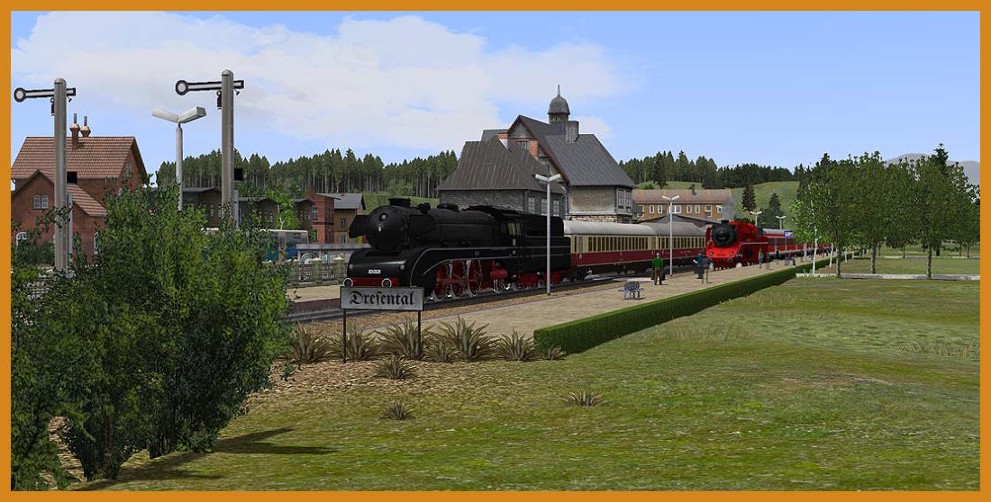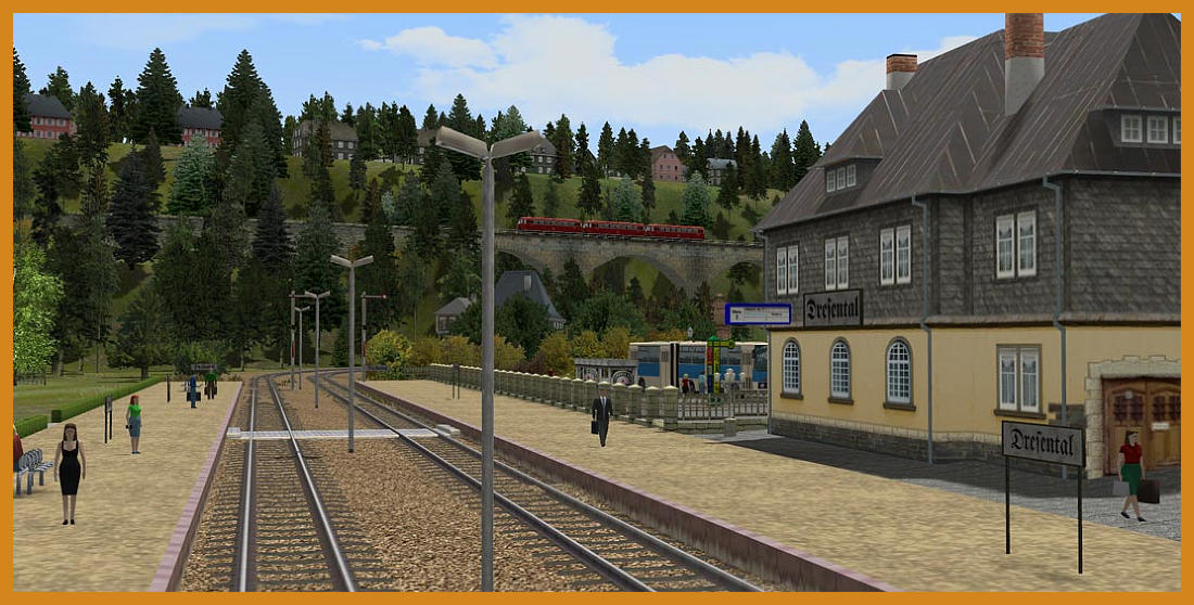 Aktuelle Bilder der Anlage Dresental.Baubeginn : 01.04.2012Aktueller Stand der Fotos 30.09.2012.Anlagendaten:Format : EEP 8.2 Expert, Plugin 2 ( Ab EEP 8 lauffähig )Breite : 5,00 kmLänge : 1,00 kmHöhe : -20,41 m bis 51,59 m Rasterpunkte pro km : 223 Knoten / kmAutomatische Kameraführung ca. 80 MinutenDie Anlage entspricht keinem Vorbild und ist aus reiner Fantasie entstanden. Das Thema Kohletransport steht im Vordergrund und soll den Transport von derZeche bis zum Güterbahnhof zur weiteren Verladung darstellen. Aber auch der kleine Kurort Dresental, der am Dresentaler See liegt, hat einiges zu bieten.Hier fühlen sich die Feriengäste in ihrem wohlverdienten Urlaub pudelwohl. Ein Rundflug mit dem Helikopter und Badespaß am See sorgen für spannende Erholung.Es befinden sich 4 Orte auf der Anlage.Bad Langensalza ist eine Kleinstadt mit Stadtpark und viel Waldgebiet im Westen. Das Dorf Wiesental befindet sich in der Mitte der Anlage und bekommt regelmäßig Lieferungen aus der Pferdezucht. Zudem schmückt ein kleiner Weinberg dasidyllische Dörfchen.Uhlstädt ist im Osten der Anlage zu finden. Hier verkehren regelmäßig Personenzüge.Die folgenden Bilder zeigen Bauabschnitte und weitere Impressionen. Viel Spaß beim anschauen.